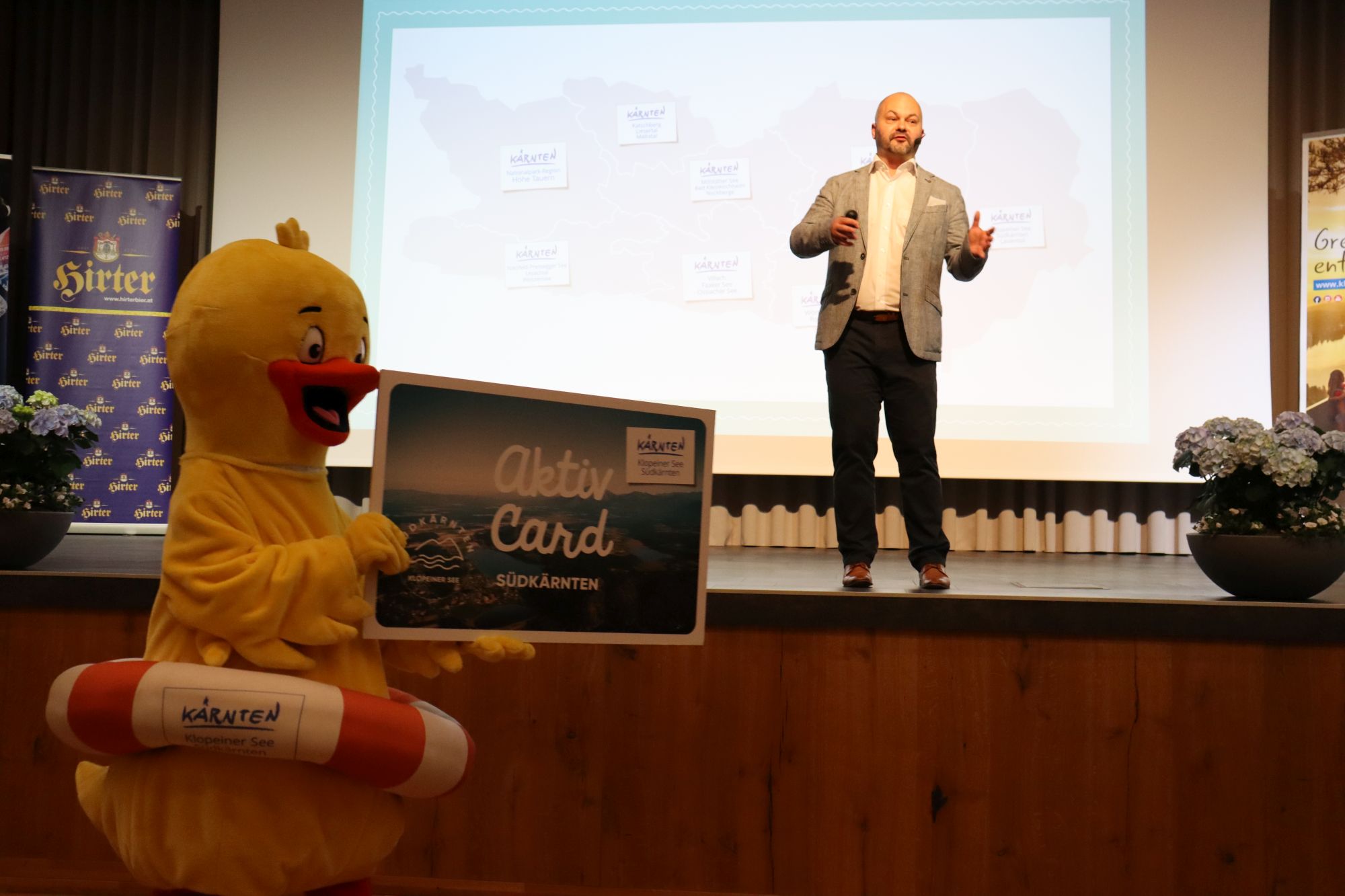 Für die interessierten Touristiker_innen wurden bereits am 16:45 Uhr Workshops mit verschiedenen Schwerpunkten geboten, im Rahmen des Abendprogramms gaben die Tourismusmanager Christian Kresse (Kärnten Werbung) und Robert Karlhofer (Tourismusregion Klopeiner See – Südkärnten) Ausblicke auf die nahende Sommersaison, ehe Stefan Verra als Star des Abends lebhaft über die Bedeutung von Körpersprache im Tourismus referierte. Er verdeutlichte: Bereits ein aufmerksamer Blick und der Einsatz der Augenbrauen können ein Schlüssel zum Erfolg mit den Kund_innen sein!